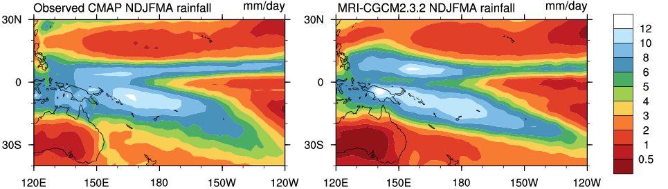 Observed Rainfall (CMAP) vs Model Rainfall: November - April (NDJFMA)